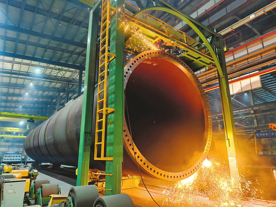 1月19日,在省級裝配式建筑產(chǎn)業(yè)鏈“鏈核”企業(yè)山西鋼構(gòu)科工有限公司智能制造車間內(nèi),一臺巨型壓力容器正進(jìn)行焊接作業(yè)。輥道與龍門架穩(wěn)穩(wěn)托舉著數(shù)十米長的鋼構(gòu)件,自動化系統(tǒng)實(shí)時監(jiān)測焊縫質(zhì)量,全力保障昔陽、陽曲、廣靈、屯留等地風(fēng)電項(xiàng)目塔筒制作。 賈曉瑞 王宇攝