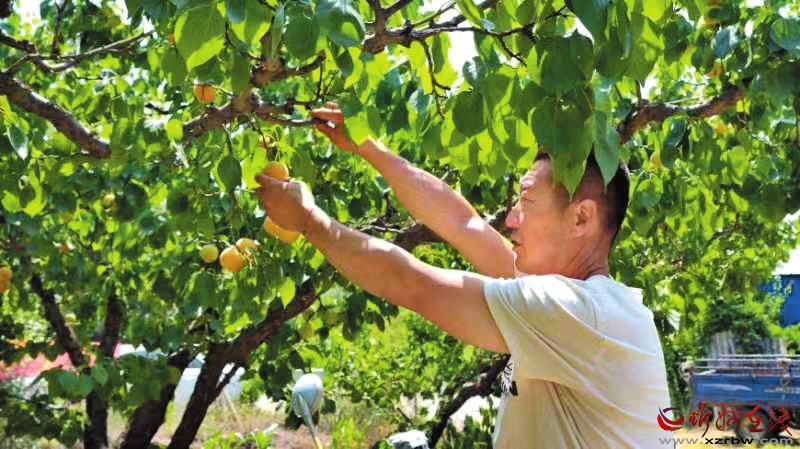 村民張連成每天早早地就來到自家杏園里摘杏,然后進行挑選、裝箱,忙得不亦樂乎?!懊刻於寄芙拥讲簧儆唵?,為了保證杏的新鮮度,必須當天現(xiàn)摘才行?!睆堖B成一邊跟記者交談,一邊熟練地將白水杏挨個包好果網(wǎng)裝箱?!拔曳N了30畝的白水杏,一畝地差不多能產(chǎn)1000多斤,按照歷年的行情來說,差不多能掙七八萬?!闭f到收入,老張笑得合不攏嘴。