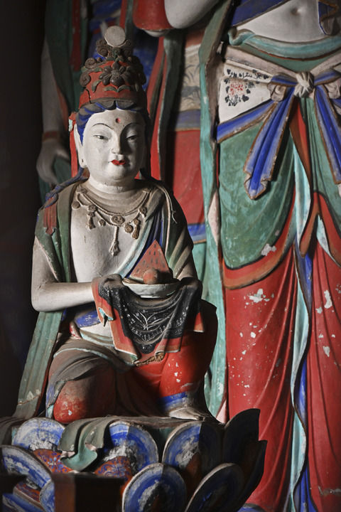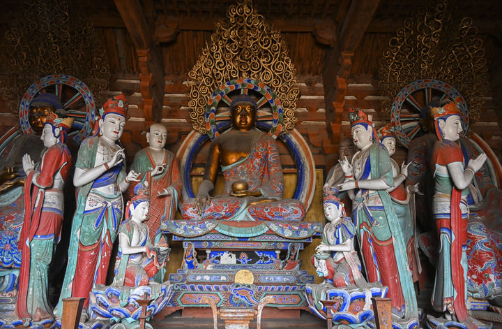 進(jìn)入東大殿內(nèi),迎面是30余尊唐代彩塑。整組塑像以釋迦牟尼為中心,脅侍菩薩、供養(yǎng)菩薩、護(hù)法金剛、隨從者姿勢不同,服飾各異,表情豐富,呈現(xiàn)出佛祖說法的宏闊壯觀場面。