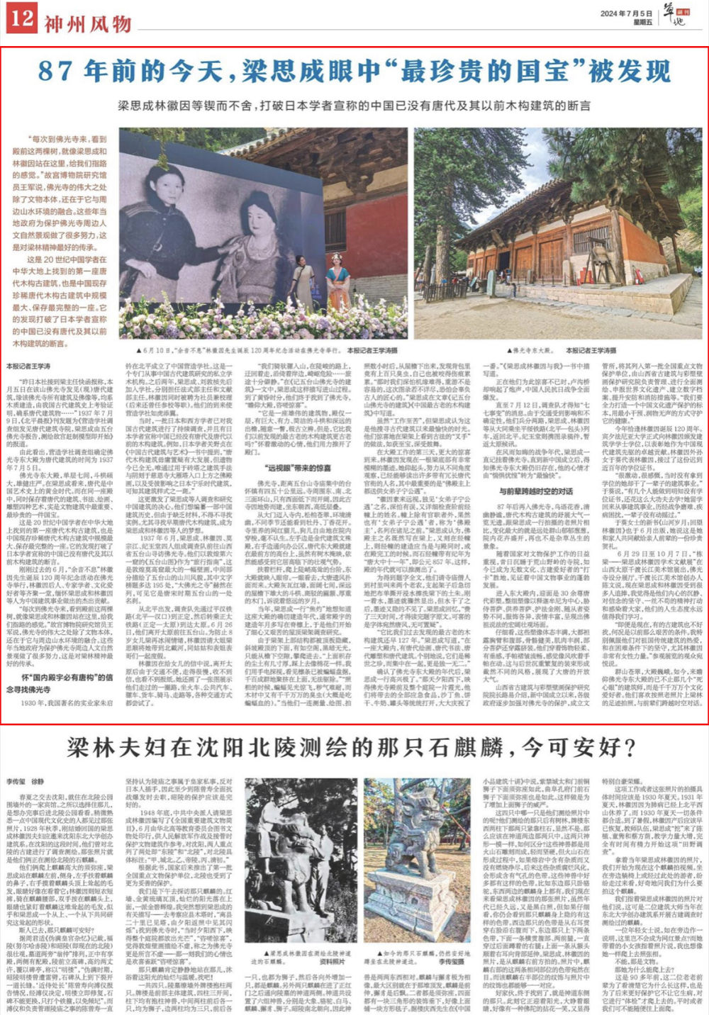 “昨日本社接到梁主任快函報(bào)稱,本月五日在該山佛光寺發(fā)見(現(xiàn))唐代建筑,緣該佛光寺所有建筑及佛像等,均系木質(zhì)建造,由我國古代建筑史上考驗(yàn)證明,確系唐代建筑物……”1937年7月9日,《北平晨報(bào)》刊發(fā)題為《營造學(xué)社調(diào)查組發(fā)見唐代建筑寺院,梁思成由五臺(tái)佛光寺報(bào)告,測繪故宮趕制模型即開始》的報(bào)道。