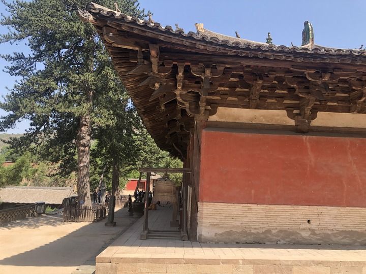 從大門邁入寺內(nèi),松柏蒼翠,環(huán)境清幽,不同季節(jié)還能看到牡丹、丁香花開。寺里養(yǎng)的網(wǎng)紅貓兒、狗兒自由地在院內(nèi)穿梭,毫不認(rèn)生。左手邊是金代建筑文殊殿,右手邊通向辦公區(qū),唐代東大殿就建在最前方的高臺(tái)上,雖然有樹木掩映,依然能感受到它居高臨下的壯觀氣勢。