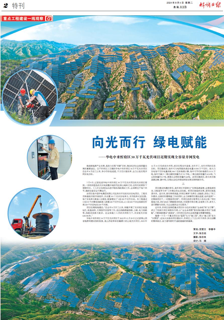 推進新能源產(chǎn)業(yè)發(fā)展,是助力實現(xiàn)“雙碳”目標、推動經(jīng)濟社會高質(zhì)量發(fā)展的重要途徑。位于忻府區(qū)三交鎮(zhèn)的華電中來忻府區(qū)30萬千瓦光伏項目自去年8月動工以來,爭分奪秒搶進度,千方百計提效率,全力以赴實現(xiàn)并網(wǎng)發(fā)電目標。