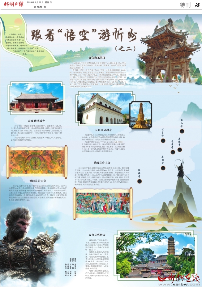 巖山寺,又稱靈巖寺,位于繁峙縣城東南45公里處的天巖村。全寺占地面積3580平方米,以精美的金代壁畫而著稱?,F(xiàn)存面積90平方米的壁畫內(nèi)容豐富、意蘊深邃,既是我國寺廟壁畫藝術(shù)的精品,又是研究宋金時代歷史、社會、宗教、美術(shù)的珍貴資料。壁畫繪畫手法多樣、技術(shù)精湛。巖山寺不僅壁畫堪稱一絕,雕塑也極具文物和藝術(shù)價值。佛壇上的觀音塑像和佛壇旁的護法力士塑像等形貌秀麗、體態(tài)優(yōu)美、威風凜凜,傳承唐代風格,是我國金代彩塑中的上品。