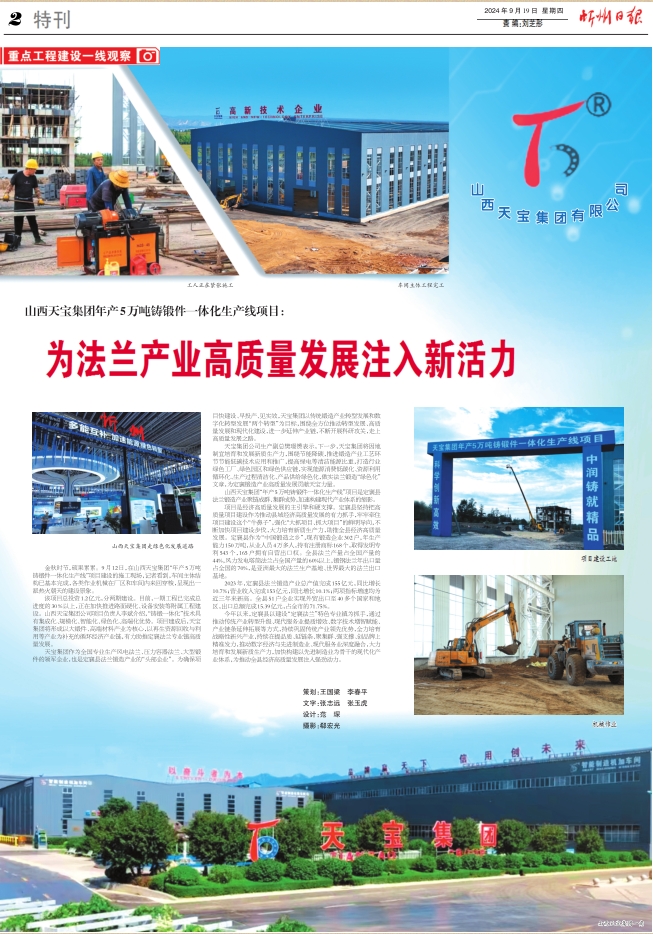 天寶集團(tuán)作為全國專業(yè)生產(chǎn)風(fēng)電法蘭、壓力容器法蘭、大型鍛件的領(lǐng)軍企業(yè),也是定襄縣法蘭鍛造產(chǎn)業(yè)的“頭部企業(yè)”。為確保項(xiàng)目快建設(shè)、早投產(chǎn)、見實(shí)效,天寶集團(tuán)以傳統(tǒng)鍛造產(chǎn)業(yè)轉(zhuǎn)型發(fā)展和數(shù)字化轉(zhuǎn)型發(fā)展“兩個(gè)轉(zhuǎn)型”為目標(biāo),圍繞全方位推動(dòng)轉(zhuǎn)型發(fā)展、高質(zhì)量發(fā)展和現(xiàn)代化建設(shè),進(jìn)一步延伸產(chǎn)業(yè)鏈,不斷開展科研攻關(guān),走上高質(zhì)量發(fā)展之路。
