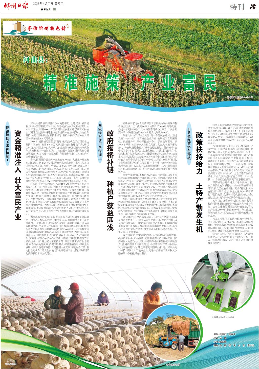 巡鎮(zhèn)鎮(zhèn)糯玉米種植加工 資金精準(zhǔn)注入 壯大富民產(chǎn)業(yè) 河曲縣巡鎮(zhèn)鎮(zhèn)沿河各行政村地勢(shì)平坦、土地肥沃、灌溉便利,農(nóng)戶主要以種植玉米為主。鎮(zhèn)政府抓住農(nóng)戶的種植習(xí)慣,從2023年開(kāi)始,利用800余萬(wàn)元鞏固銜接資金實(shí)施了糯玉米種植加工項(xiàng)目,通過(guò)流轉(zhuǎn)耕地集中連片規(guī)模種植,并提供就業(yè)崗位和種植、施肥、管理等全過(guò)程技術(shù)指導(dǎo),種植戶獲得了比種植大田玉米每畝高出500元的收益。 2023年,巡鎮(zhèn)鎮(zhèn)的夏營(yíng)、河南等5村聯(lián)合成立了山西拓豐達(dá)科技有限公司,利用800余萬(wàn)元鞏固銜接資金建設(shè)廠房、購(gòu)買生產(chǎn)線,與河曲縣一畝良田現(xiàn)代農(nóng)業(yè)有限公司以租賃的形式合作,實(shí)施糯玉米種植加工項(xiàng)目。河曲縣一畝良田現(xiàn)代農(nóng)業(yè)有限公司投資700萬(wàn)元進(jìn)行土地流轉(zhuǎn)、種植培養(yǎng)與推廣,實(shí)施生產(chǎn)并完成銷售等環(huán)節(jié)。 當(dāng)年,該項(xiàng)目的糯玉米種植基地為1050畝,共計(jì)生產(chǎn)糯玉米300余萬(wàn)穗。到2024年3月,所有產(chǎn)品完成銷售。其中,線上直播銷售270萬(wàn)穗,完成訂單量33萬(wàn)單,日出單量穩(wěn)定在6000-7000單;線下銷售30萬(wàn)穗。產(chǎn)品成功打入杭州、武漢、西安、重慶等大城市的商超、團(tuán)購(gòu)市場(chǎng)等,實(shí)現(xiàn)產(chǎn)值700余萬(wàn)元。該項(xiàng)目在全鏈條經(jīng)營(yíng)過(guò)程中提供95個(gè)就業(yè)崗位,累計(jì)雇傭監(jiān)測(cè)戶、脫貧戶共7人,共支付河曲縣工人工資46.65萬(wàn)元。其中,支付給夏營(yíng)村村民工資33.5萬(wàn)元,支付給河南等村的村民工資9.8萬(wàn)元。 在取得已有經(jīng)驗(yàn)的基礎(chǔ)上,2024年,糯玉米種植被納入巡鎮(zhèn)鎮(zhèn)“一鄉(xiāng)一業(yè)”發(fā)展規(guī)劃,種植補(bǔ)貼標(biāo)準(zhǔn)提高,種植戶的信心得到提升,種植戶數(shù)相較上年明顯增加。全鎮(zhèn)共種植糯玉米1750畝,其中一畝良田現(xiàn)代農(nóng)業(yè)有限公司種植937.5畝,與種植戶簽訂了種植合同的有812.5畝,結(jié)算后訂單總值為152萬(wàn)元。種植過(guò)程中,一畝良田現(xiàn)代農(nóng)業(yè)有限公司提供了種植、施肥、管理、采收等環(huán)節(jié)的全程陪護(hù)保姆式服務(wù),有力地保證了種植戶的種植收益。2024年,項(xiàng)目在種植、加工過(guò)程中提供158個(gè)就業(yè)崗位,累計(jì)雇傭監(jiān)測(cè)戶、脫貧戶共16人,共計(jì)支付河曲縣工人工資86.65萬(wàn)元,加工季生產(chǎn)550萬(wàn)穗糯玉米,產(chǎn)值突破1100萬(wàn)元。 連續(xù)兩年的成功實(shí)踐,極大地提振了河曲發(fā)展糯玉米種植加工的信心。2024年的加工季結(jié)束后,河曲縣制定了下一步發(fā)展計(jì)劃:一是加大投入,擴(kuò)容增產(chǎn),配套廠房設(shè)施,實(shí)現(xiàn)廠區(qū)1000萬(wàn)穗的產(chǎn)能;二是加大產(chǎn)業(yè)扶持力度,提高種植補(bǔ)貼標(biāo)準(zhǔn),鼓勵(lì)全縣農(nóng)戶積極參與,將種植基地?cái)U(kuò)展至3000畝以上;三是制定快遞、物流扶持政策,鼓勵(lì)企業(yè)參與全國(guó)電商競(jìng)爭(zhēng);四是加大農(nóng)業(yè)科技投入,引進(jìn)新技術(shù),發(fā)展“數(shù)字農(nóng)業(yè)、定制農(nóng)業(yè)”,打造可視化、可溯源的“放心農(nóng)產(chǎn)品”生產(chǎn)鏈,同時(shí)推廣滴灌、噴灌等節(jié)水灌溉技術(shù),推廣測(cè)土配方施肥技術(shù)等;五是以糯玉米產(chǎn)業(yè)為基礎(chǔ),結(jié)合河曲地理優(yōu)勢(shì),依據(jù)市場(chǎng)需求,積極開(kāi)拓新品,探索企業(yè)發(fā)展、村民受益的新路徑;六是挖掘文化資源,深度融合產(chǎn)品,著力打造河曲農(nóng)產(chǎn)品文化高地,讓“做好巡鎮(zhèn)玉米,講好河曲故事”的美好愿望早日變成現(xiàn)實(shí)。 劉家溝村食用菌深加工 政府搭橋補(bǔ)鏈 種植戶獲益匪淺 社梁鄉(xiāng)劉家溝村食用菌深加工項(xiàng)目是由河曲縣統(tǒng)籌整合資金建設(shè)。這個(gè)投資50萬(wàn)元的項(xiàng)目于2023年底建成后,經(jīng)過(guò)一年的初步運(yùn)行,為村集體取得收益3萬(wàn)元,二次分配到戶后,村集體經(jīng)濟(jì)組織620人的人均增收為40元。 劉家溝村位于河曲縣南部,是一個(gè)傳統(tǒng)農(nóng)業(yè)村。通過(guò)發(fā)展“一鄉(xiāng)一業(yè)”,培育特色農(nóng)業(yè)產(chǎn)業(yè),發(fā)展起了食用菌種植。說(shuō)起這件事,不得不提起一個(gè)人,那就是劉雨雄。從2019年開(kāi)始,他帶著家人種植食用菌。經(jīng)過(guò)幾年來(lái)不懈的努力,種植規(guī)模越來(lái)越大,日子也越過(guò)越好。他的成功,也帶動(dòng)了鄉(xiāng)親們。社梁鄉(xiāng)黨委政府也從中找到了振興鄉(xiāng)村、壯大村集體經(jīng)濟(jì)的新路子。通過(guò)調(diào)研走訪、請(qǐng)教專家,結(jié)合本地實(shí)際,社梁鄉(xiāng)決定充分發(fā)揮專業(yè)合作社和參與生產(chǎn)經(jīng)營(yíng)農(nóng)戶的兩個(gè)經(jīng)營(yíng)主體的“雙帶動(dòng)、雙示范、雙服務(wù)”作用,將食用菌種植產(chǎn)業(yè)確立為發(fā)展“一鄉(xiāng)一業(yè)”培育特色產(chǎn)業(yè)的先行示范項(xiàng)目,鼓勵(lì)農(nóng)戶發(fā)展食用菌種植。如今,食用菌種