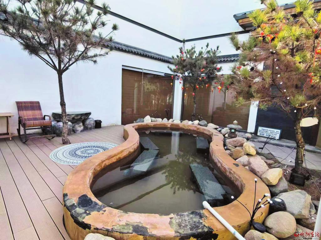 這家“升級版”的集餐飲、茶飲、溫泉康養(yǎng)、旅游度假于一體大型民宿占地近三畝,設(shè)計、建筑別具匠心。在有限的空間內(nèi),11個獨立的院落沒有“平鋪直敘”,通過朝向和方位的搭配互補(bǔ),造成了曲徑通幽的效果。連接11個小院的路面遍布草坪,行人落腳處是一個個星羅棋布的舊磨盤。這一農(nóng)耕文明元素的巧妙點綴只是一個細(xì)節(jié),卻足以看出經(jīng)營者的良苦用心。11個院落就是11個獨立的溫泉民宿,院落、房間大小各異,內(nèi)部格局、設(shè)施布置也各不相同,一個共同的特點是充分考慮到了私密性。院內(nèi)、房間皆有造型各異的溫泉泡池,加水、放水皆由前臺智能調(diào)控。有的院落建起燒烤臺,統(tǒng)一提供木炭和燒烤用具。實行“管家式”一對一服務(wù),精美茶點敞開供應(yīng)。當(dāng)街的餐飲、茶飲店起了個別致而有寓意的名字——“蒙太奇”,字面是電影剪輯術(shù)語,暗含的意思是:歡迎內(nèi)蒙古、太原的游客來奇村……