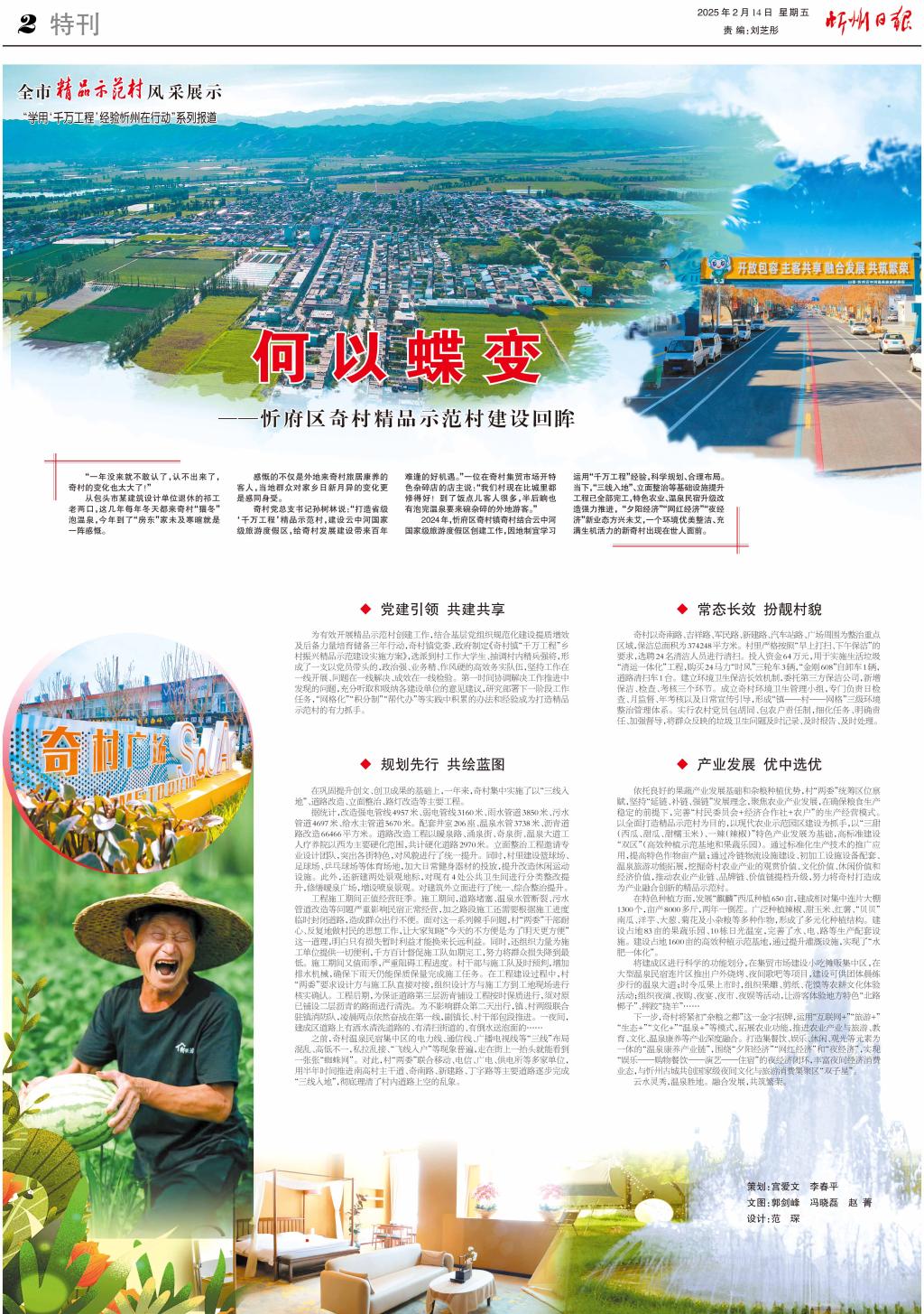 2024年,忻府區(qū)奇村鎮(zhèn)奇村結(jié)合云中河國家級旅游度假區(qū)創(chuàng)建工作,因地制宜學(xué)習(xí)運(yùn)用“千萬工程”經(jīng)驗,科學(xué)規(guī)劃、合理布局。當(dāng)下,“三線入地”、立面整治等基礎(chǔ)設(shè)施提升工程已全部完工,特色農(nóng)業(yè)、溫泉民宿升級改造強(qiáng)力推進(jìn), “夕陽經(jīng)濟(jì)”“網(wǎng)紅經(jīng)濟(jì)”“夜經(jīng)濟(jì)”新業(yè)態(tài)方興未艾,一個環(huán)境優(yōu)美整潔、充滿生機(jī)活力的新奇村出現(xiàn)在世人面前。