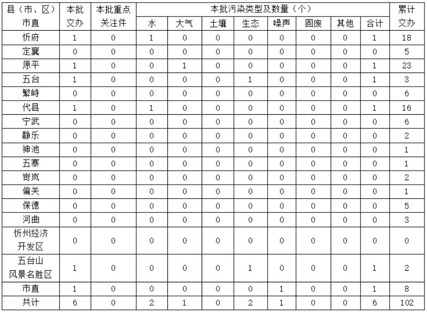 按區(qū)域和部門劃分,忻府區(qū)1件、原平市1件、代縣1件、五臺(tái)縣1件、市直單位1件、五臺(tái)山風(fēng)景名勝區(qū)1件。本批轉(zhuǎn)辦的信訪件,涉及生態(tài)環(huán)境問(wèn)題6個(gè),其中,生態(tài)破壞問(wèn)題2個(gè)、水污染問(wèn)題2個(gè)、大氣污染問(wèn)題1個(gè)、噪聲污染問(wèn)題1個(gè)。