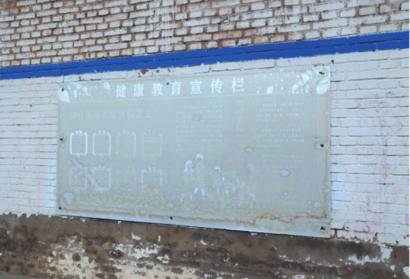 忻府區(qū)大檀村北大街公益廣告牌破損、褪色。