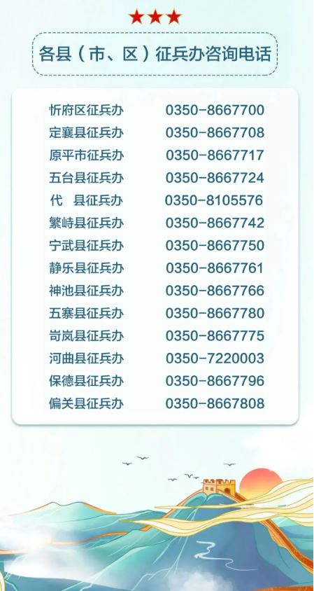 各縣(市、區(qū))征兵辦公室咨詢電話,請關(guān)注并進入微信公眾號“山西征兵”點擊下方“聯(lián)系我們”中“各地征兵辦電話”查詢。