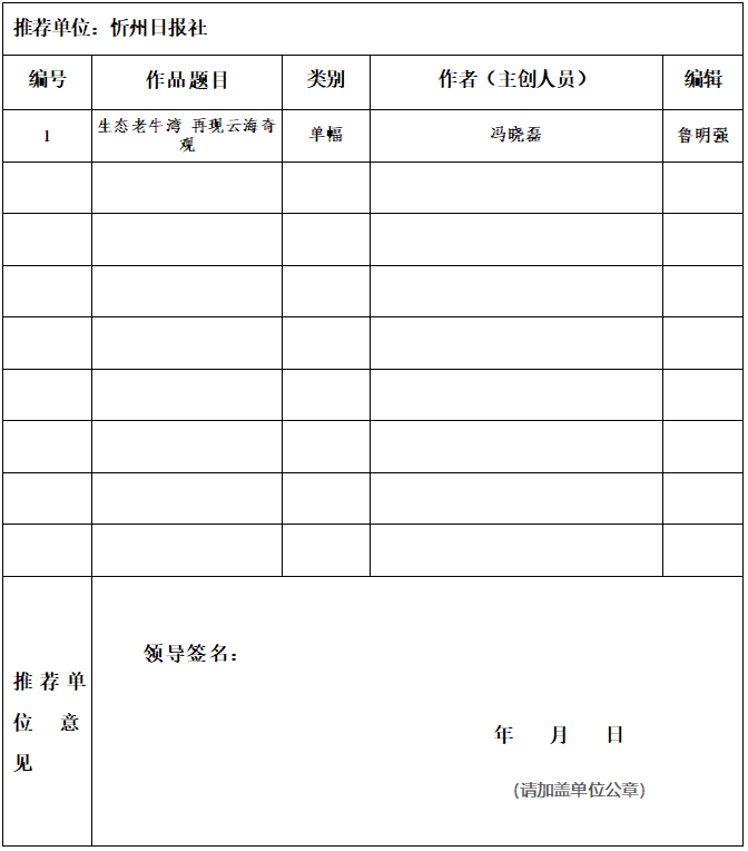 “備注”欄內請標注作品類別,如新媒體、報紙、通訊社、廣播、電視、期刊等。同時備注是否為深度報道、輿論監(jiān)督、時事評論作品。請按照規(guī)定名額報送,超額報送的,撤下此目錄中排序靠后的作品。
