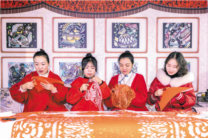 1月17日,岳紅霞(右二)帶領工作室學員創(chuàng)作“金牛送福”剪紙。近日,曾獲全國剪紙大賽“金剪刀獎”、貴州省畢節(jié)市黔西縣非遺傳承人岳紅霞帶領工作室學員創(chuàng)作“金牛送?!毕盗兄黝}作品,迎接農(nóng)歷牛年。 (新華社發(fā) 范暉 攝)