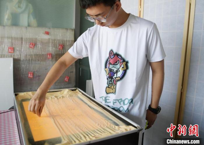 “比方說(看)油畫、國畫之類的,然后我們進(jìn)行二次創(chuàng)作,繪制出小稿,最后去繪制沙畫?!彪拷榻B,自6月中旬著手設(shè)計(jì)以來,自己每天都要在一個(gè)悶熱的“小黑屋”里待上幾個(gè)小時(shí),創(chuàng)作過程總計(jì)花費(fèi)近80個(gè)小時(shí)。