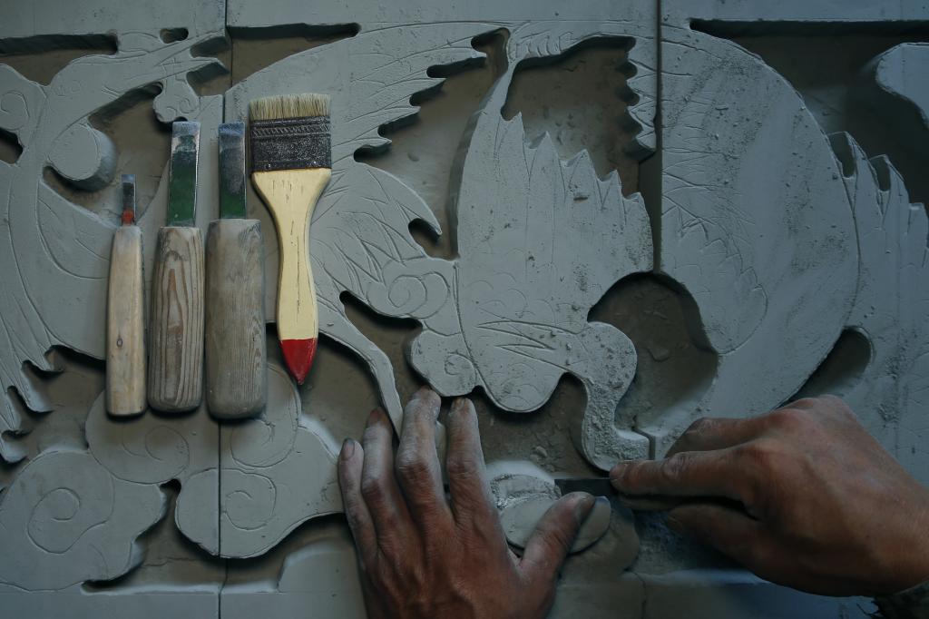 雕前先“打樣”:把設計稿拓印在涂抹過石灰水的磚面上,或者在磚塊上直接描畫?,F(xiàn)在許多外地磚雕加工廠多用電腦打樣,生產(chǎn)出來的是“制式”產(chǎn)品,千篇一律。磚雕常用的圖案王鎖貴早已爛熟于心,想要的圖案在青磚上一揮而就,當真是“鐵劃銀鉤”、揮灑自如。如此,則構圖更加生動,細節(jié)更加充盈,最主要的是絕不雷同。接下來“打坯”:用鑿子或刻刀粗略勾勒畫面輪廓,分出基本層次。最后是“出細”:運用多種工具,或鏟、或刻、或挑,以刻畫細節(jié)。