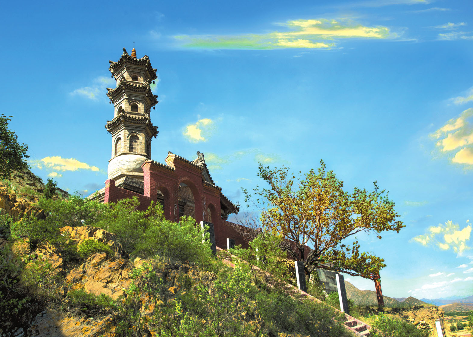 同河流域中部,還有一座獨(dú)特的小山,名叫“福壽山”,其形酷似倒扣的大碗。山南有一泓玉泉水,清澈可鑒,為同河最大支流。李居禎與福壽山還有一段神話故事。李居禎戎馬一生,身經(jīng)百戰(zhàn),雖至老年,每日仍要騎馬射箭。一日,他乘坐一匹大紅馬,信馬由韁,來到福壽山下,山腳下有一溫泉,名叫玉泉,滾滾而出,于是,他在福壽山頂修建起寺廟,山上寺廟以泉命名,叫玉泉寺。乾隆版《崞縣志》載:“玉泉寺:面沱水,背龍潛,左同溪,右回光,映帶朝拱,宛然勝概”。