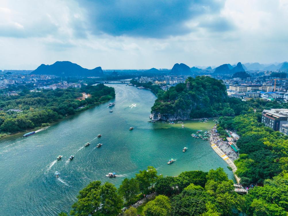 在桂林象鼻山景區(qū)一帶,游客乘船游覽漓江(無人機照片)。新華社發(fā)(劉崢 攝)