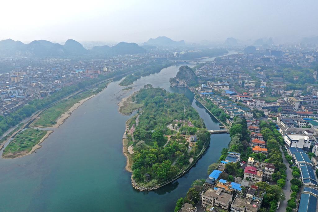 生態(tài)修復(fù)改造后的漓江伏龍洲景色(無人機照片)。新華社記者 周華 攝