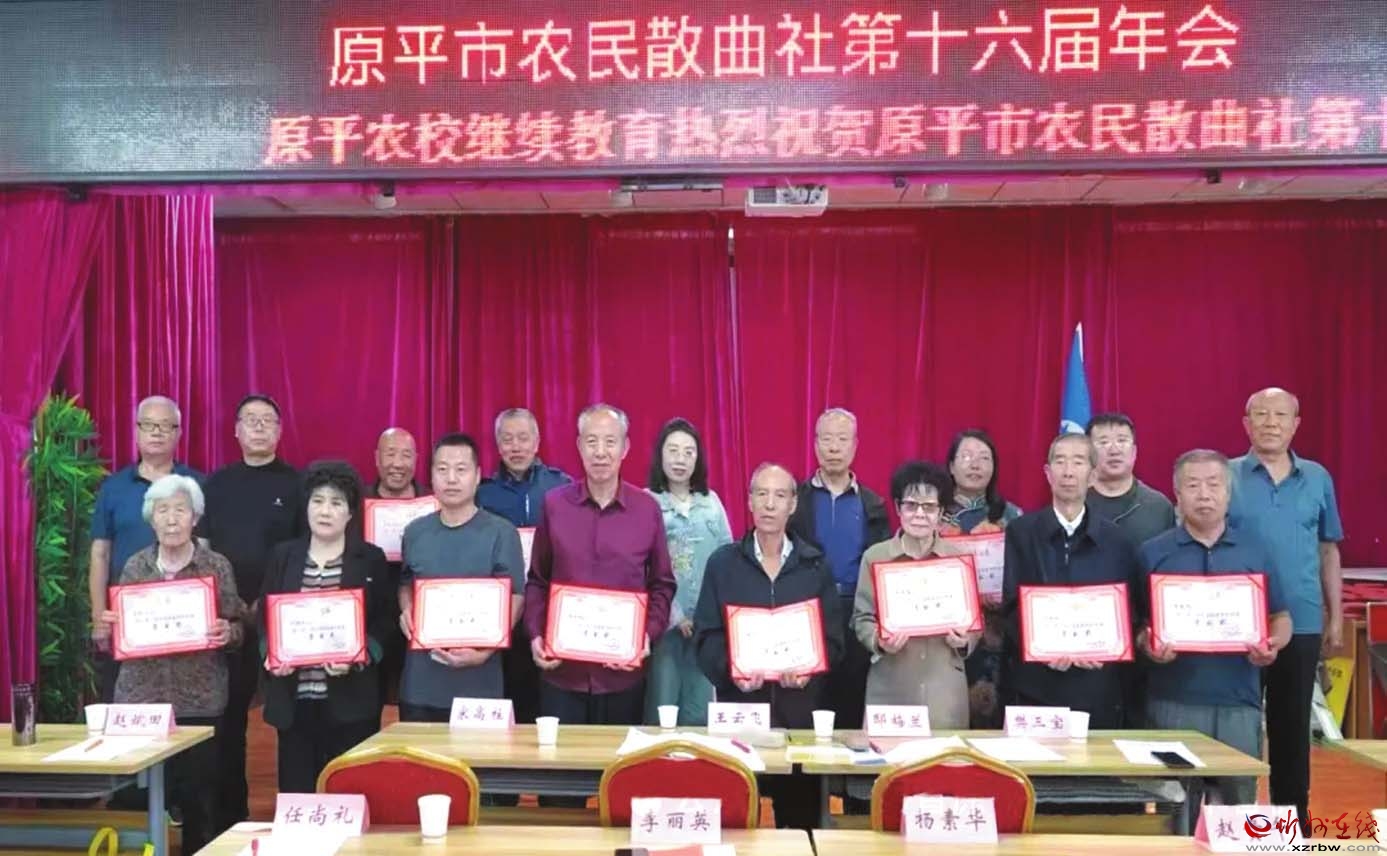 散曲社朗誦部的曲友們?cè)谟茡P(yáng)音樂(lè)聲中,激情澎湃地朗誦著五谷飄香的農(nóng)民散曲,20多名優(yōu)秀社員受到表彰,展示出原平農(nóng)民散曲的喜慶豐收景象。“詩(shī)如潮,農(nóng)民種曲名聲在,情如火,南腔北調(diào)心澎湃。曲如海,同舟共濟(jì)承傳愛(ài),暖如春,一年四季花不敗?;ㄩ_(kāi)滿地鮮,曲韻熔天籟,好一個(gè)震驚曲界田園派。”這首散曲《正宮·塞鴻秋》道出了散曲社社員們的心聲。