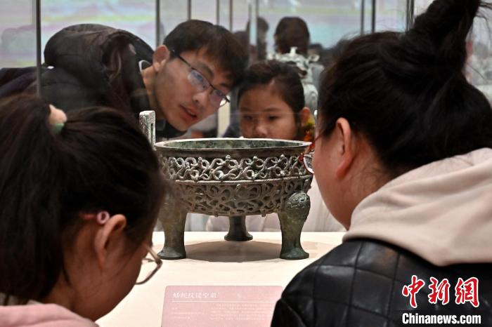 春節(jié)期間,山西博物院推出“尋蛇——藏在山西博物院里的蛇”展覽。圖為1月23日,民眾圍觀館內(nèi)展出的蟠蛇紋鏤空鼎。 中新社記者 韋亮 攝