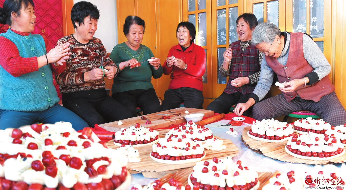 開開心心蒸花糕。 張晉蘭攝 年節(jié)美食蘊年味 “臘八節(jié)”拉開了過年的序幕,臘月二十三,又稱“小年”。臨近年根,置辦年貨、洗洗涮涮,人們掃家除塵盡可能提早在臘月二十三前完成。為了飽享年節(jié)的輕松美好,在忻州民間有正月里不蒸灶的說法,人們要將年后一整個正月內(nèi)的所有主食集中在臘月加工制熟。過去,由于忻州小麥種植有限,唯獨過年才有口福享受幾頓白面食品,所以面食蒸灶是一件必不可少的事情。饃饃、花糕、棗山、錢龍,有女兒的還要有毛籃兒。上午蒸灶,下午搟豆面,這似乎也成為一種慣例。捏過花糕棗山的大面案依然還在炕邊擺著,把豆面和成硬硬的,搟得薄如紙張,折成幾折,切成一指寬左右的寬條,這是專為大年初一中午準(zhǔn)備的“寬心面”。 黃米糕是忻州一帶盛行的一種美食,它以黍子(軟糜子)為原料,經(jīng)碾壓成為糕面。由于忻州油料作物有限,不便油炸,只能撩少許油在鍋里擦糕,俗稱“撥糕”,外焦里嫩,色澤十分好看,擦出后沓在瓷盔或小甕中保存。糕是粗糧中最為高檔的自制食品,是年節(jié)必備的主食,吃糕有高升的意思。 撥完糕后,人們還要“吊煎鍋”?!凹邋仭毙稳缂屣灒愿吡幻婕由僭S榆(樹)皮面為原料,攪成糊狀后轉(zhuǎn)鍋邊流下,用鏟子輕輕攤開,蓋上鍋撇子(高粱秸稈經(jīng)碾壓去瓤后編織而成的鍋蓋墊),幾分鐘后揭出,折幾折切成一指寬的長條,待正月里調(diào)上酸窩白菜(腌白菜)或燴菜食用,這也是一道粗糧細(xì)作的預(yù)制主食。 “攤糊兒”也是忻州民間必不可少的美食。早年間農(nóng)家取暖多用泥制火爐,攤糊兒時往往會多擺幾個火爐子,也有在院中專門盤一個多火口的攤糊兒爐臺,分別在爐口擱上幾個生鐵鑄造的“糊兒鏊子”攤糊兒?!昂齼骸钡脑弦杂裁用鏋橹?,也有用高粱面攤的。“糊兒”邊厚心薄,直徑約五六寸左右,出鏊后趁熱對折,擱在條盤或笸籮中儲存,攤糊兒微甜略帶酸味,也是年后別具風(fēng)味的一種主食。 除此預(yù)制主食外,還要提前加工一些燒肉、煎肉、豆腐、粉絲、粉條等副食,以備正月里食用。 正月里準(zhǔn)備好這些美食,便可以盡情享受年節(jié)的輕松自在,體會一年辛勤換來的幸福美好。
