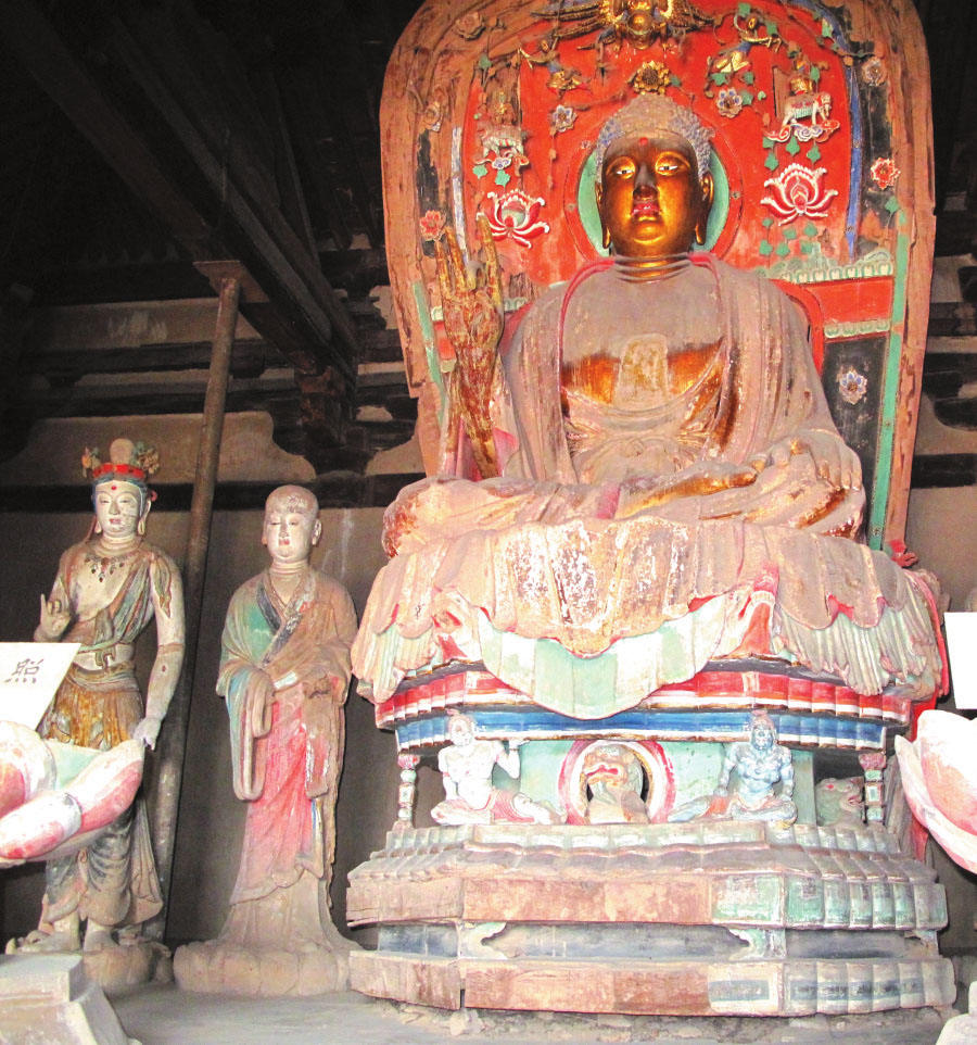 五臺山南禪寺唐代雕塑 王文君攝 唐高宗與武則天:鳳凰雙巡 龍朔二年(662年),唐高宗李治命會昌寺僧人會賾繪制《五臺山圖》,這是中國歷史上首幅佛教圣地全景圖。武則天為后之時,她多次派人在幾座臺頂建“則天塔”。長壽二年(693年),名僧菩提流志等新譯《寶雨經》,稱菩薩現女身,為武則天登上帝位大造輿論。長安二年(702年),武則天自稱“神游五頂(清涼五臺山的五大高峰)”,敕命重建五臺山的代表寺院清涼寺。 宋太宗:梵剎新生 太平興國五年(980年),宋太宗趙光義敕建太平興國寺,并鑄銅鐘置于顯通寺。這位以“燭影斧聲”聞名的帝王,在五臺山留下獨特的文化密碼:現存佛光寺文殊殿的北宋壁畫中,武將裝束的文殊菩薩騎著青獅,恰與宋代“以武立國”的意識形態(tài)暗合。