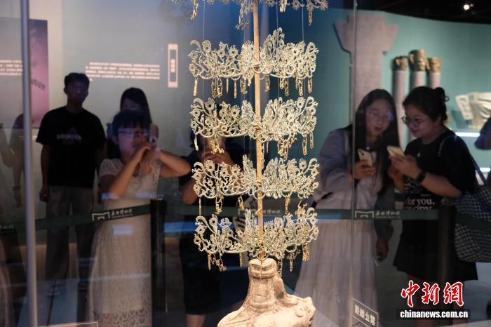 8月2日,游客在浙江寧波觀看三臺縣博物館藏“馬猴搖錢樹樹身”。 林波 攝