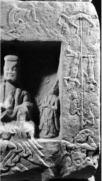 請看下圖。這幅圖是云岡第38窟中的一幅石刻墨線描摹圖,它應該叫《橦倒樂伎圖》。圖中的表演與峨口撓閣非常相似,比今天的峨口撓閣更驚險、更具觀賞性。如果我們把這幅圖和峨口撓閣比較一下,會清楚地發(fā)現(xiàn),峨口撓閣藝術歷史久遠、文化根脈綿長,會發(fā)現(xiàn)峨口撓閣曾經(jīng)的歷史高度和文化沃土的厚度。