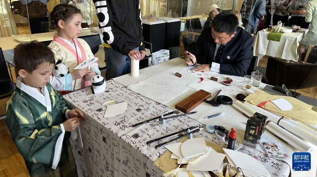 5月7日,在瑞典首都斯德哥爾摩的中國文化中心,瑞典兒童觀看中國書法展示。