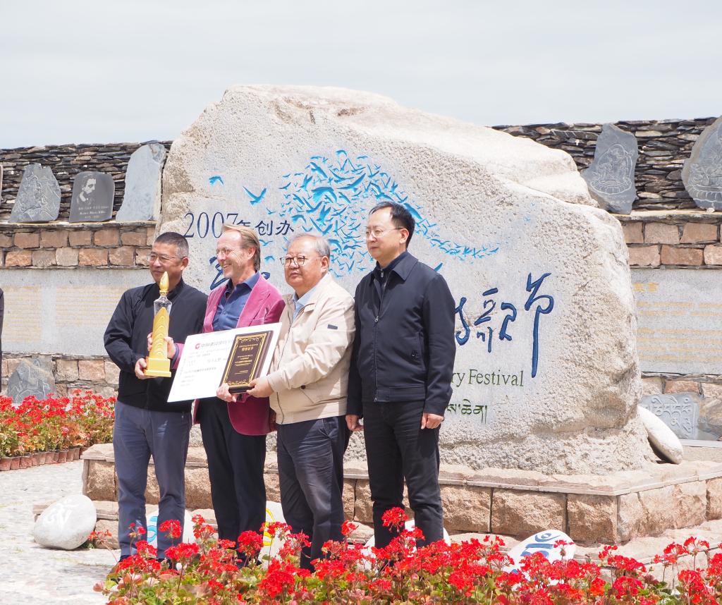 6月29日,吉狄馬加(右二)為澳大利亞詩人馬克·特雷尼克(左二)頒獎。新華社記者 白瑪央措 攝