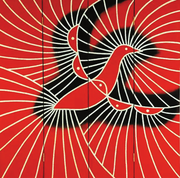 藝術(shù)家潘草原的《上升勢態(tài)》系列在制作方法上延續(xù)傳統(tǒng)工藝,使用不同質(zhì)地的瓦灰調(diào)入大漆制作背景,在表現(xiàn)形式上徹底顛覆固有的畫面結(jié)構(gòu),由符號化的裝飾元素組成。部落文化圖騰的抽象紋樣代表某種精神象征,將肉眼不可見的精神現(xiàn)象物質(zhì)化。有別于傳統(tǒng)“平光亮”的打磨工藝,藝術(shù)家利用瓦灰打磨后的不同灰度層次,在畫面中形成似霧朦朧的氤氳氛圍。鑲嵌的寶石、金屬和螺鈿,不同材質(zhì)折射的光澤質(zhì)感與大漆的黑、瓦灰形成鮮明對比,符號圖騰在二維平面中顯示一種“上升勢態(tài)”。如今,在世界文明交流互鑒的新時(shí)代,深得中華傳統(tǒng)文化神韻的大漆藝術(shù)應(yīng)該秉持兼收并蓄的原則,煥發(fā)出新的時(shí)代光彩。(黃雨田)