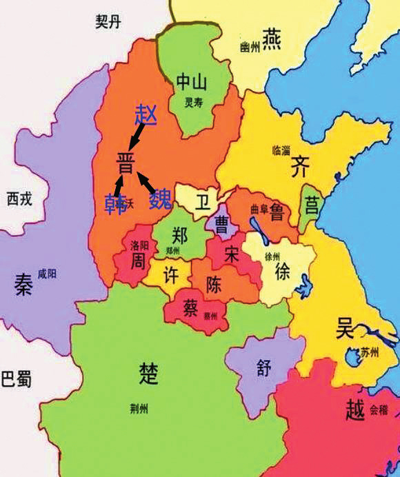 晉文公執(zhí)政繼承其父三軍六卿制,韓、趙、魏、范、智、中行六卿各有自己的領地,勢力日漸擴張,他們一方面維護晉國霸業(yè),另一方面蠶食晉國君權(quán)和國土。到晉定公時期,晉國權(quán)勢趨向衰弱,六卿之間也相互蠶食領地。晉出公時期,智氏組織韓、趙、魏討伐范氏和中行氏,迫使二氏出逃,后韓、趙、魏、智四家瓜分了范氏和中行氏所有封地。四氏中,智氏領土最多,勢力最強,故向韓、趙、魏索要所得封地,韓、魏懼而滿足智氏要求,趙斷然拒之,被迫出逃,智氏組織韓、魏擊之未成。事后,韓、魏共識前車之鑒,唇亡齒寒,于是韓、趙、魏三卿聯(lián)合擊智,盡滅智氏全族。
