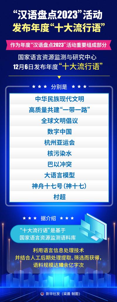 新華社北京12月6日電(記者史競男)作為年度“漢語盤點2023”活動重要組成部分,國家語言資源監(jiān)測與研究中心12月6日發(fā)布年度“十大流行語”,分別是:中華民族現(xiàn)代文明、高質量共建“一帶一路”、全球文明倡議、數(shù)字中國、杭州亞運會、核污染水、巴以沖突、大語言模型、神舟十七號(神十七)、村超。
