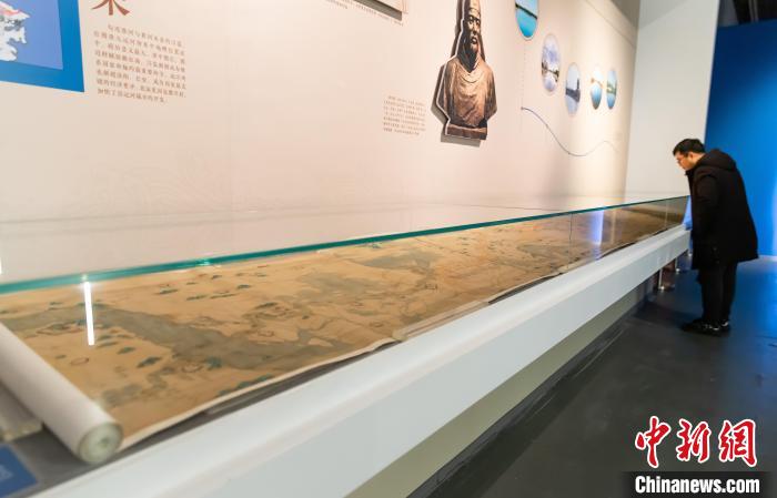 近日,國家一級文物清乾隆時期《漕運圖卷》亮相天津博物館。圖為游客正在參觀該展品。王在御 攝 “這幅圖大約繪于清代乾隆時期,其作畫精美,比一般漕運圖提供的信息更多?!薄肮练斑h(yuǎn)——天津運河文化展”策展人、天津博物館歷史部工作人員安秋州向記者講解,圖中河水顏色的不同,代表了不同河段的水質(zhì),譬如青色代表該河段水源豐富,黃色則代表比較渾濁,甚至在天津三岔河口通向出??诘牟糠诌€畫出了海浪的形狀。 “該圖還標(biāo)注了北京紫禁城,揚州大明寺平山堂、高旻寺等名勝古跡。像這樣比較精致的漕運圖,也側(cè)面體現(xiàn)出大運河在當(dāng)時的重要性。”安秋州說。