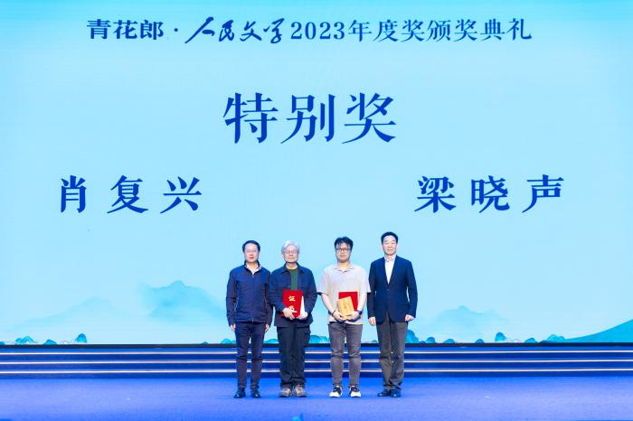 著名作家肖復(fù)興、梁曉聲獲得本屆“人民文學(xué)獎(jiǎng)”特別獎(jiǎng),梁曉聲小說(shuō)責(zé)任編輯梁豪代為領(lǐng)獎(jiǎng)。圖片來(lái)源:主辦方供圖