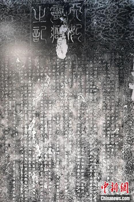 《天妃靈應(yīng)之記》碑高162厘米、寬78厘米、厚16厘米。碑以黑色頁巖為料,碑額正中篆書“天妃靈應(yīng)之記”,周邊飾以祥云捧月(日)圖案,兩旁陰刻如意云水紋,碑體邊框飾一周纏枝花卉紋。碑文楷書直下計31行,全文1177字,除其中有若干字磨損外,碑文清晰,至今基本完整可讀。