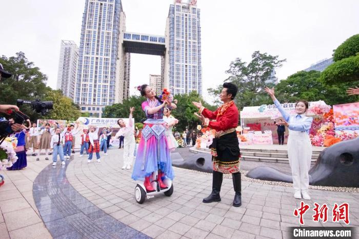 此外,在“廣西三月三·八桂嘉年華”開幕式暨“四季村歌”活動(dòng)啟動(dòng)儀式上,廣西戲劇院“新劉三姐”扮演者陳慧身著絢麗民族盛裝,攜手多地游客共唱山歌,融合平衡車表演和戲曲唱腔的演繹方式,展現(xiàn)廣西山歌與時(shí)俱進(jìn)演變過程,為廣西“三月三”這場(chǎng)民族盛會(huì)添新潮。