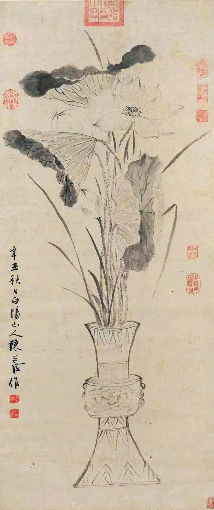 陳淳的《瓶荷寫生圖》中,一青銅花觚內(nèi)插數(shù)枝荷花,細葉菖蒲點綴其間。向上伸展的枝葉幾乎占滿畫面,盡顯夏日花草的勁挺之氣與蓬勃生機。此作給人最大的視覺感受是不拘一格的瀟灑筆觸與靈動造型,尤其靠下方的兩片荷葉,以及右側(cè)彎折垂下的一片細葉,甚至顯現(xiàn)出一絲不加修飾的潦草、頹敗之感,而恰是對此等細節(jié)的保留,生動體現(xiàn)出植物自然的生長姿態(tài)。