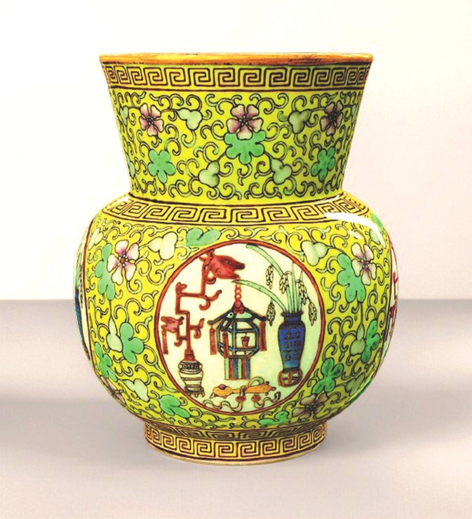 故宮博物院收藏的清代粉彩葫蘆萬代五谷豐登紋渣斗,內(nèi)壁繪粉彩纏枝葫蘆紋,藤蔓相連,花果繁茂,寓意“子孫綿延”“多子多?!?;外壁黃地亦繪相同葫蘆紋,設(shè)四處圓形開光,內(nèi)有宮燈、花瓶、如意、稻穗等,寓意“平安如意”“五谷豐登”。開光內(nèi)花瓶飾“囍”字,表明為皇帝大婚用瓷,既祈子嗣繁衍,又添喜慶吉祥。整器色彩明艷,紋飾繁密華麗,盡顯清代晚期宮廷裝飾的典型風格。