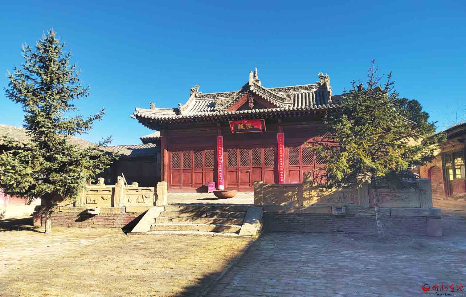 一進院布局,中軸線現(xiàn)存有正殿1棟,兩側(cè)建有配殿,西北角建有偏殿。正殿磚砌臺基,面寬五間,進深六椽,七檁前后廊式構架,前檐斗拱為五踩,后檐為三踩斗拱,單檐懸山頂。前設月臺,建有抱廈三間,單檐歇山頂?,F(xiàn)新塑像3尊,正殿梁架有彩繪。