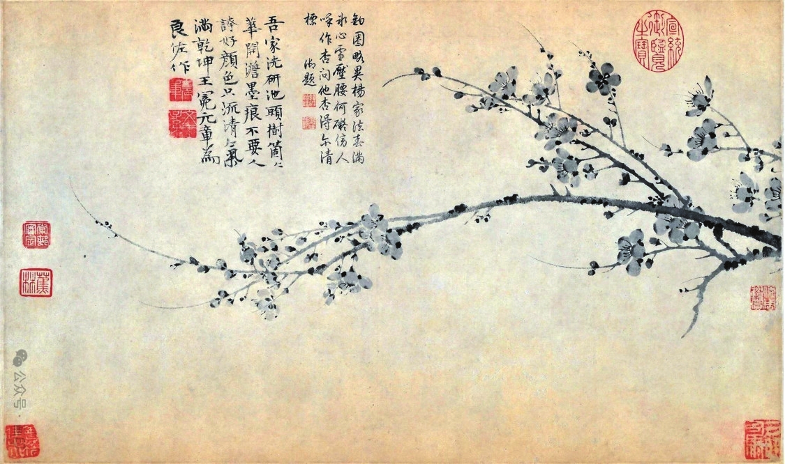 王冕《墨梅圖》是元代梅花題材繪畫的代表作,既展現(xiàn)了文人的傲然風骨,亦革新了北宋以來的梅花筆法。與眾多畫家筆下的“官梅”相比,王冕更喜愛以“野梅”入題,這或許因為“野梅”的風骨更為突出,也更能寄托畫家對自由的追逐。王冕筆下的墨梅擺脫了枯燥外形與彎曲枝蔓的束縛,彰顯不凡的氣度與精神。清人朱方靄在《畫梅題記》中說:“宋人畫梅,大都疏枝淺蕊,至元煮石山農(nóng)(王冕的號)始易以繁花,千叢萬簇,倍覺豐神綽約,珠胎隱現(xiàn),為此花別開生面。”