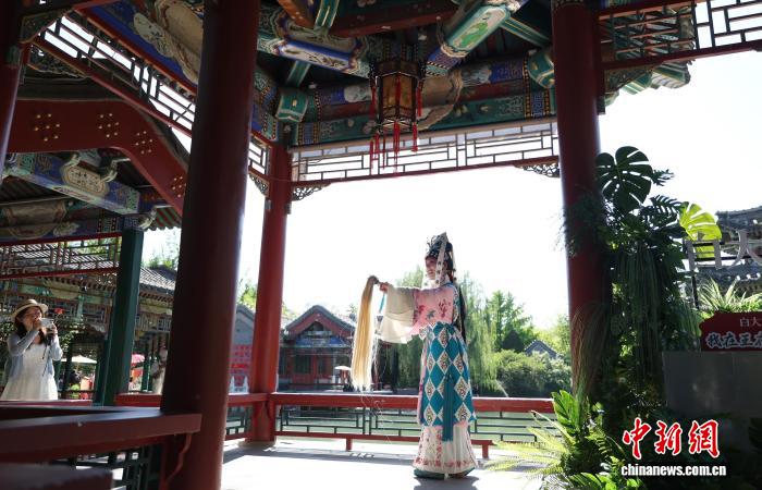 喝茶聽?wèi)?,是刻在東方美學(xué)里的浪漫?;顒悠陂g,銀安殿、后寢宮草坪、連廊、戲臺、湖面等多個點位輪番上演昆曲、京劇、評彈等傳統(tǒng)戲曲,朝陽劇場雜技團帶來金獎雜技,高校民樂演奏等精彩演出穿插其中,來自北京市第八十中學(xué)金帆舞蹈團的學(xué)生代表,帶來精彩的中國民族民間舞蹈串燒。首次在北京亮相的“一葉輕舟”伴著古樸烏篷船輕泊水面,盡顯江南雅致。竹笛悠揚、水波輕漾,游客移步換景間就能邂逅好戲。