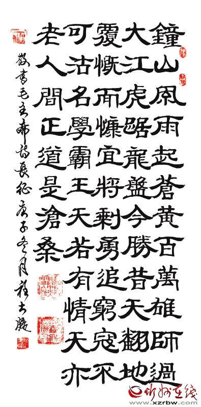 二是程老有真功。他一人能熟練書寫甲骨、篆書、魏碑、曹全隸、乙瑛隸、章草、歐柳楷、顏趙楷、行楷、行書、行草、草書、伊秉綬隸、創(chuàng)新粗圓、創(chuàng)新仿宋、創(chuàng)新大黑、創(chuàng)新角篆、仿毛體18種書體(見圖)。還會畫畫寫詩,詩書畫樣樣精通。對程大凝而言,臨帖是他最大的快樂,創(chuàng)作是他最大的滿足?,F(xiàn)在他的工作室有4000多幅作品。退休后參加全國性書法大賽就獲獎300余次。