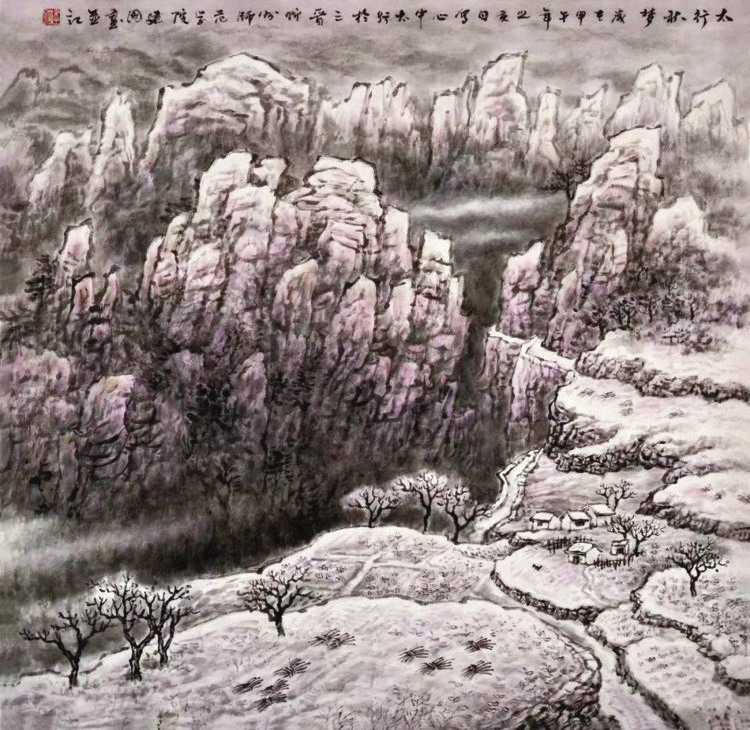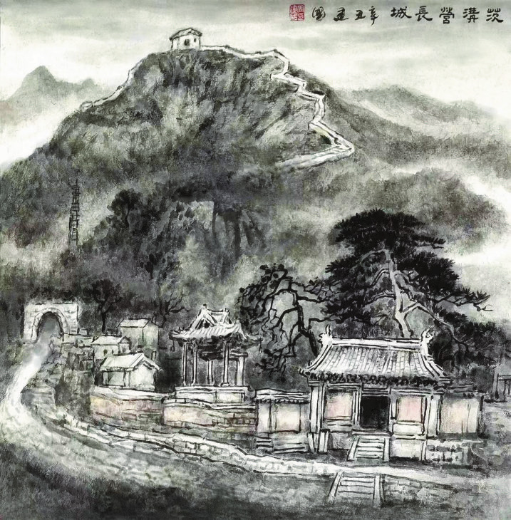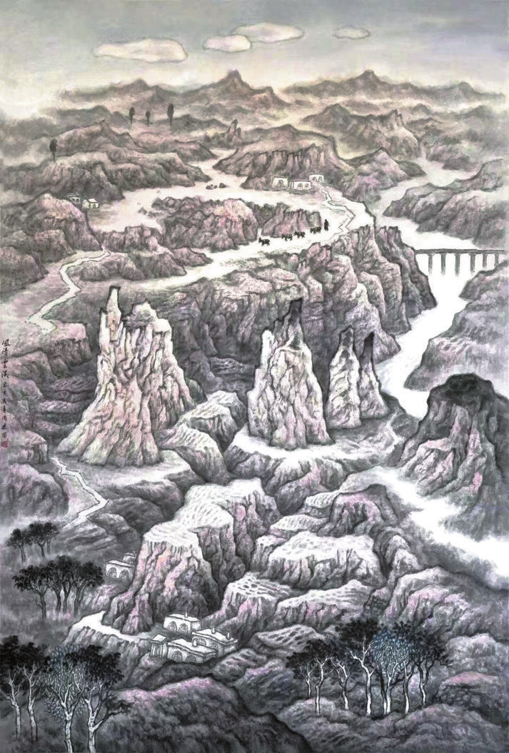 周建國對中國山水畫有著獨特見解,出版過畫集《中國美術名家精品鑒賞·周建國作品集》。他的創(chuàng)作之路主要分為兩個時期,前期追求中西融合,后期則回歸傳統(tǒng)。前期作品《曉月》《古原除夕》《月色》等,多取材于黃土高原,真切流露出其對黃土地的深情厚愛:早上飄起的炊煙演繹著百姓的勤勞,喧鬧的腰鼓彰顯著鄉(xiāng)民熱愛生活的豪情,晨起上課的學生更是承載著當?shù)厝藵M滿的希望。周建國將黃土地上的一草一木皆升華為獨特且富有個性的生命體,畫面處理側重將西方油畫的光影巧妙融入作品,寓動于靜,動靜相宜,彰顯“高貴的單純,靜穆的偉大”的內(nèi)在張力。同時將傳統(tǒng)山水繪畫的造型、空間結構、筆法設色皆進行改變——黃土溝壑的幾何化處理、筆墨色調(diào)的反復拿捏、耐人尋味的空間布局,都體現(xiàn)了其特殊的創(chuàng)作理念。相較前期,周建國后期的作品更加注重對內(nèi)在美的挖掘,如《風月同天》《家園》《和諧家園》《生息之地》《太行月色》等代表作品,表達對祖國山河大川的熱愛,走“外師造化,中得心源”之道,畫風趨向率真,試圖突破中國山水繪畫的表象審美,追尋深層意義的表達。