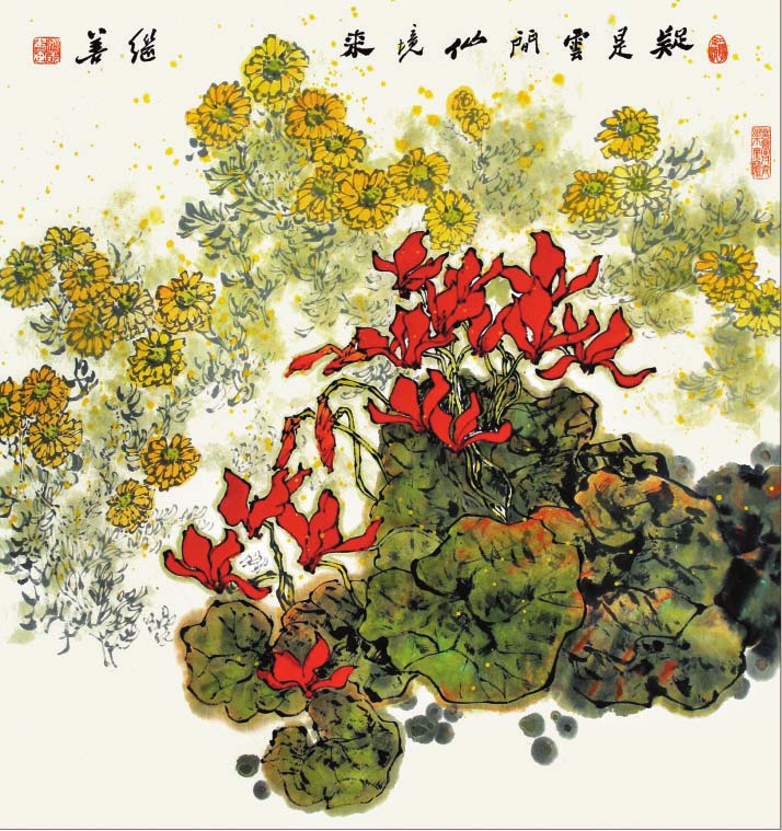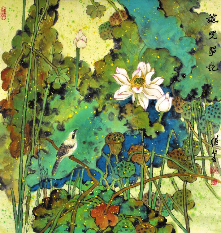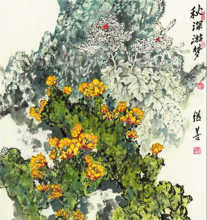 郜繼善的重彩花鳥畫偏傳統(tǒng),筆法細膩工整,色彩明麗典雅,構(gòu)圖大氣別致,情趣盎然,意境深遠。作品中各種元素有機融合,自然穿插,形成和諧有序的布局,讓人既能感受到自然界的豐富與絢爛,又可體味藝術(shù)帶來的愉悅和感動。在他的筆下,重彩成為了最具藝術(shù)感染力的手段,也是最有個性藝術(shù)特征的語言,鮮明、強烈,可謂“脫盡媚俗寫重彩”。