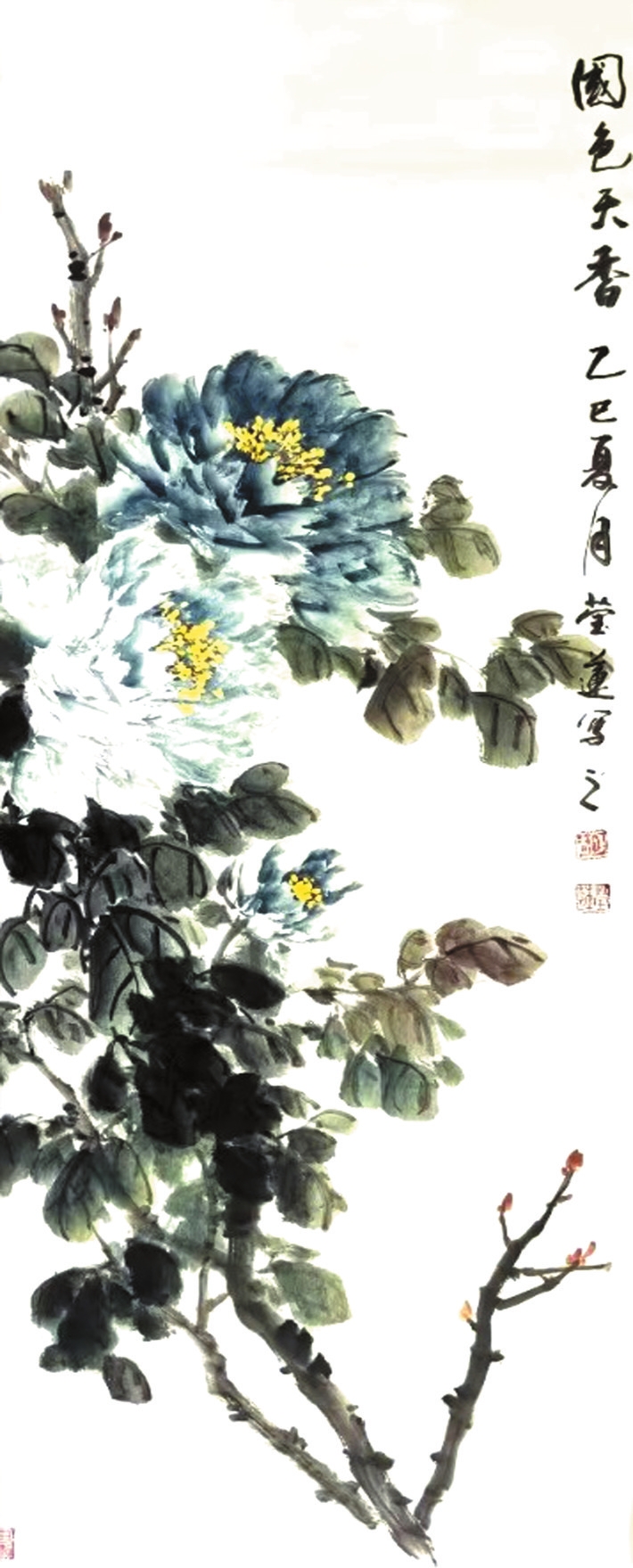 胡瑩蓮的筆墨并非刻意炫技,而是循著“應(yīng)物象形”之理自然生發(fā):牡丹花瓣以淡彩層層暈染,輔以墨線勾勒輪廓,既顯牡丹的華貴之姿,亦存筆墨的清勁骨力;紫藤枝條以側(cè)鋒揮掃而出,既有“折釵股”般的圓勁質(zhì)感,亦見(jiàn)藤蔓的靈動(dòng)意趣。恰如北宋畫家郭熙在《林泉高致》中所言的“筆補(bǔ)造化”,胡瑩蓮以筆墨為媒介,貫通物象的自然本真與人文意蘊(yùn)。