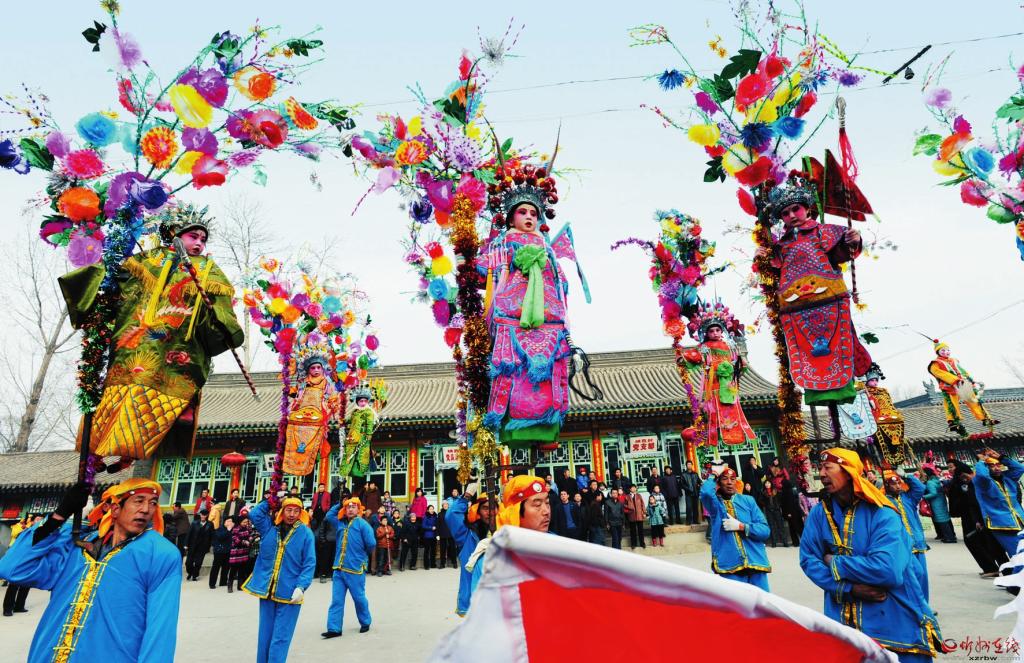 楊繼興 攝 “我們的撓閣,高高地?fù)显谒{(lán)天上,孩子們代表了我們的心愿和理想,音樂舞起來的時(shí)候,就放飛了人們的理想與希望?!?/p> 從代縣縣城驅(qū)車向東南方行駛25公里,在峨口鎮(zhèn)郝街村,我們一行見到了75歲的峨口撓閣國(guó)家級(jí)非物質(zhì)文化遺產(chǎn)傳承人郝來喜。坐在堂屋的土炕上,講起撓閣,郝來喜滔滔不絕,滿臉的心馳神往,古稀之年的他全然沒有一絲老態(tài)。 1948年,郝來喜出生于代縣峨口鎮(zhèn)郝街村,這里正是峨口撓閣的發(fā)祥地之一。從小,他就看著村里的撓閣表演長(zhǎng)大。 “我小時(shí)候就盼著過年‘登閣’,但是那時(shí)候只有女孩兒可以登撓閣,所以父親就把我扮成女妝反串上場(chǎng)?!?/p> “登閣”,意即登高望遠(yuǎn),可以祈求吉星高照,四季平安,能夠“登閣”是每個(gè)峨口小孩最盼望的事。 “第一次‘登閣’,在寒風(fēng)里搖搖晃晃,雖然又冷又怕,可一熱鬧起來,就什么都忘了。”從5歲“登閣”,22歲撓閣,再到2017年成為國(guó)家級(jí)非遺傳承人,郝來喜已經(jīng)與撓閣打了將近70年交道,曾被他撓過的小孩現(xiàn)在最大的也四五十歲了。 提起當(dāng)年盛況,郝來喜依舊難掩喜悅,“峨口村村都可以組織起隊(duì)伍,少則十二架,多則二十四架,也叫全架。每年正月十三到十六,三個(gè)村一共六十多架撓閣全體出動(dòng)?!焙聛硐舱f,在從前,撓閣是一項(xiàng)全民參與的文藝活動(dòng),家家戶戶積極性都很高。 “從正月初十開始,女人們就動(dòng)手扎花裝飾撓閣架,準(zhǔn)備表演服裝,到表演的日子,更是全村出動(dòng),化妝的、表演的、幫忙的,一村人熱熱鬧鬧、忙忙碌碌,早上九點(diǎn)多從峨口出發(fā),一行人浩浩蕩蕩到代縣縣城,熱鬧的音樂聲能轟動(dòng)整個(gè)古城。” 在郝來喜眉飛色舞的講述中,撓閣表演的盛景仿佛就在眼前。 “我們都不談報(bào)酬,小孩們給幾顆糖,大人們散幾支煙,村民們各家出一點(diǎn)干糧,每一個(gè)人都愿意在表演時(shí)出最大的力氣,這是我們心里的一場(chǎng)盛會(huì)。” 郝來喜說,每一個(gè)參與的人,都是出于對(duì)撓閣發(fā)自內(nèi)心的熱愛。 曾在峨口工作生活多年的工商銀行代縣支行職工高軍萍是峨口撓閣的忠實(shí)觀眾,在她的記憶中,撓閣是元宵節(jié)“鬧紅火”的重頭戲。從清早樂隊(duì)的嗩吶聲響起開始,各個(gè)村的撓閣高手就齊聚廣場(chǎng),各個(gè)隊(duì)伍間既有合作,又有比拼,熱熱鬧鬧的表演成為代縣街頭的一大風(fēng)景,“用萬人空巷來形容也毫不夸張?!备哕娖颊f。 “撓閣”作為一種民間藝術(shù),蘊(yùn)含著豐富的文化內(nèi)涵。在晉北方言中,撓閣是指抬起或舉高的“閣樓”(引申為仙閣和女孩兒),是一種撓起孩童進(jìn)行表演的藝術(shù)形式。于2008年被列入第二批國(guó)家級(jí)非物質(zhì)文化遺產(chǎn)名錄。 “在文化界,峨口撓閣被譽(yù)為無言的戲劇,空中的舞蹈,流動(dòng)的雜技,鮮活的雕塑。撓閣是一門融合了傳統(tǒng)文化精粹的綜合性藝術(shù),孩子們的扮相,是楊家將、紅樓夢(mèng)、白蛇傳里的人物,不必開口,就可以上演一出好戲。鼓點(diǎn)一起,大人們跳起舞步,孩子們?cè)诳罩谢螋骠嫫鹞?,或翻著跟頭,代縣千百年來的風(fēng)土文化凝聚在其中。”對(duì)峨口撓閣傾注了大量心血的代縣人民政府副縣長(zhǎng)陳文秀總結(jié)道。 傳統(tǒng)文化正以特有的方式浸潤(rùn)著這座僅有22萬人口的晉北小城,滲透到人們的生活中?!斑@里的農(nóng)民,不僅是鋤禾日當(dāng)午,農(nóng)閑的時(shí)候,他們放下鋤頭,音樂一起,撓起架子就可以扭上一曲?!痹陉愇男阊劾?,普通農(nóng)民遇上藝術(shù),就不再平凡,每一個(gè)農(nóng)民都是藝術(shù)家。 “峨口撓閣是一項(xiàng)歷史悠久,有著頑強(qiáng)生命力的民間藝術(shù)。在最傳統(tǒng)的撓閣中,農(nóng)民們會(huì)把自給自足的辣椒、玉米裝點(diǎn)在抬架上,以此來慶祝豐收,并祈禱來年風(fēng)調(diào)雨順。后來出現(xiàn)了人物形象的塑造,逐漸演化成我們今天所見的樣子?!贝h當(dāng)?shù)匚幕瘜W(xué)者、山西省作家協(xié)會(huì)會(huì)員李培根說,峨口撓閣歷史悠久,源遠(yuǎn)流長(zhǎng)。 李培根介紹,峨口撓閣經(jīng)歷了原始社會(huì)有巢氏至秦代模仿樹原生態(tài)的孕育期,漢代至南北朝無伴奏表演到器樂和鳴的轉(zhuǎn)型期,隋唐至民國(guó)的表演、服飾、伴奏相配套的成熟期,新中國(guó)成立至上世紀(jì)六七十年代初期的興衰更迭的曲折發(fā)展期,以及實(shí)施“民族傳統(tǒng)文化保護(hù)”工程后的弘揚(yáng)、振興期,迄今已有1700多年歷史。當(dāng)?shù)爻鐾恋哪媳背召冈煨鸵彩嵌肟趽祥w在歷史長(zhǎng)河中的記錄與體現(xiàn)。 粗獷的舞步,質(zhì)樸的音樂,經(jīng)過1700多年歲月洗禮的撓閣,更像是穿行在漫長(zhǎng)歷史長(zhǎng)河里的時(shí)光剪影。背縛撓閣的壯漢,在山西“八大套”器樂的伴奏下,腳下用力,氣沉丹田,以腰為軸,扭動(dòng)大胯,把握重心,張弛有度地扭動(dòng),舞步沉穩(wěn)輕緩,依照踩“葫蘆”、對(duì)扭、走“8”字、轉(zhuǎn)圈、直行、穿插等步法不時(shí)變換隊(duì)形。 郝來喜說,與太原的徐溝背棍不同,峨口撓閣的鐵架為活架,幾個(gè)連接處均可前后左右任意活動(dòng),因而表現(xiàn)更為活潑靈動(dòng)。撓閣架上的小孩