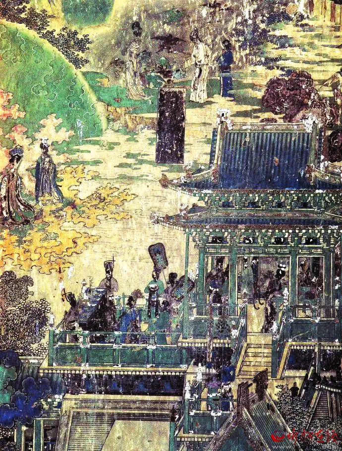 畫(huà)面中,有頭戴冠冕、身著長(zhǎng)袍的王子,焚香祈禱的王后;有嬉戲玩耍的兒童,酒樓市井里的說(shuō)唱賣(mài)藝者;還有撐傘的、捧鳥(niǎo)籠的凡夫俗子,儼然一幅幅生動(dòng)的古代宮廷生活圖、古代市井圖。豪華宮殿、樓閣、古塔、作坊、民居各類建筑應(yīng)有盡有,無(wú)不體現(xiàn)出畫(huà)師高超的技藝。