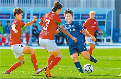 8月23日,武漢車都江大隊球員王霜(左三)在比賽中射門。新華社記者 江文耀攝