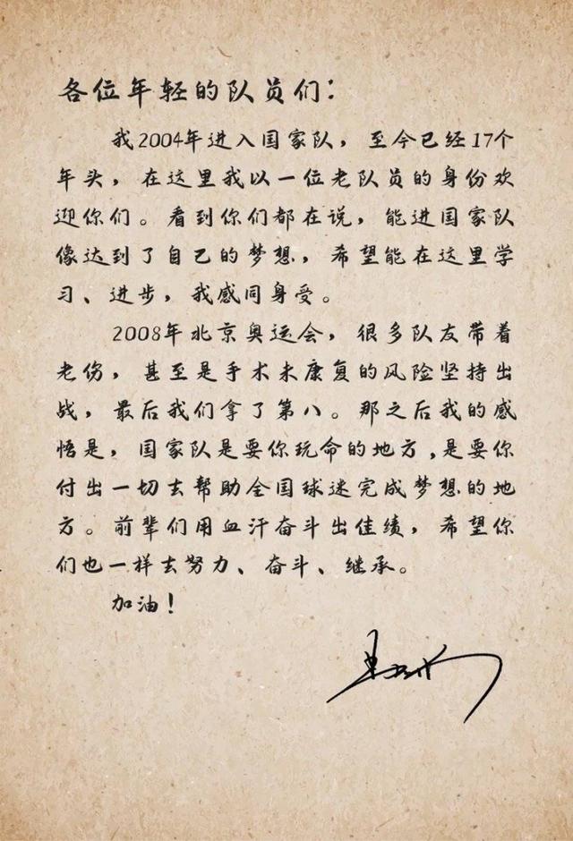 易建聯(lián)在信中回顧了自己首次入選國(guó)家隊(duì)的感受,表示自己完全能理解新隊(duì)員此刻的心情,他尤其強(qiáng)調(diào)了榮譽(yù)感與責(zé)任感,對(duì)這些小兄弟們說(shuō)“國(guó)家隊(duì)是要你玩命的地方”,“各位年輕隊(duì)員們,我2004年進(jìn)入國(guó)家隊(duì),至今已經(jīng)有17個(gè)年頭,在這里我以一位老隊(duì)員的身份歡迎你們??吹侥銈兌荚谡f(shuō),能進(jìn)國(guó)家隊(duì)像達(dá)到了自己的夢(mèng)想,希望能在這里學(xué)習(xí)、進(jìn)步,我感同身受。2008年北京奧運(yùn)會(huì),很多隊(duì)友帶著老傷,甚至是手術(shù)未康復(fù)的風(fēng)險(xiǎn)堅(jiān)持出戰(zhàn),最后我們拿到了第八。那之后我的感悟是,國(guó)家隊(duì)是要你玩命的地方,是要你付出一切去幫助全國(guó)球迷完成夢(mèng)想的地方。前輩們用血汗奮斗出佳績(jī),希望你們也一樣去努力、奮斗、繼承?!?/span>