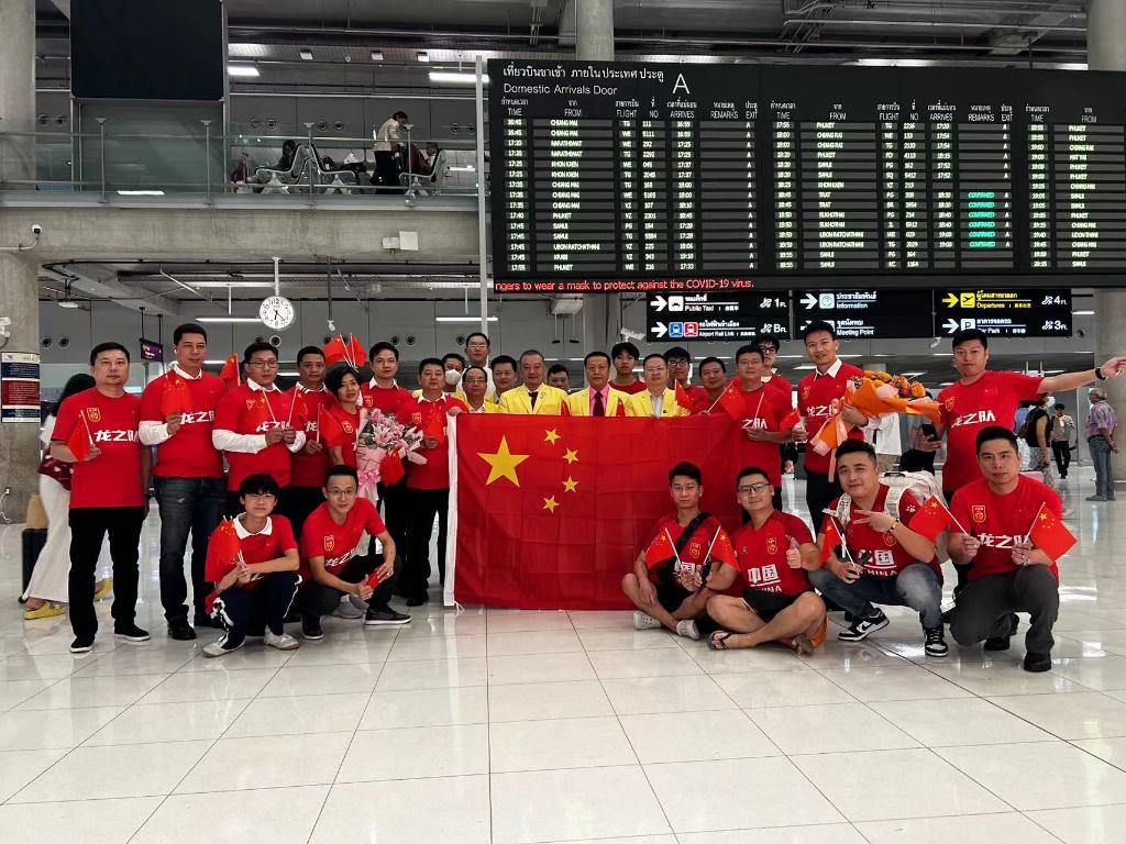 中國球迷在泰國機場準備迎接國足抵達。 在國足出征之際,不少球迷也踏上了征程?!褒堉牎鼻蛎詴L簡滿根目前已經(jīng)抵達泰國,該球迷會組織了超過600名球迷從國內(nèi)飛往泰國。據(jù)了解泰國也有超過2000名華人一起為國足加油助威。 在結束和泰國隊的比賽后,國足將返回深圳,21日將坐鎮(zhèn)主場龍崗大運中心體育場迎來與韓國隊的比賽。 (責任編輯:蔡文斌) |